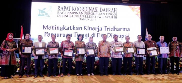 Penghargaan diterima oleh Rektor UMN Ninok Leksono saat menghadiri Rapat Koordinasi Daerah bagi Pimpinan Perguruan Tinggi di Lingkungan LLDIKTI Wilayah III Tahun 2018 di Hotel Bidakara, Jakarta, hari Selasa 12, Februari.
